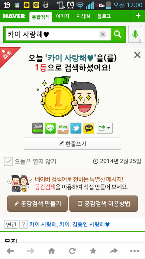 나 1등 처음해봐 사실 검색 잘 안하는데 네이버에 뭐 검색하다가 몇일전에 어떤인어가 자랑한거 생각나서 59분이길래 감색했더니 1등이래ㅠㅠㅠㅠㅠ 1등 해보고싶었는데 종인아 사랑해♥ 이영광을 너에게♥