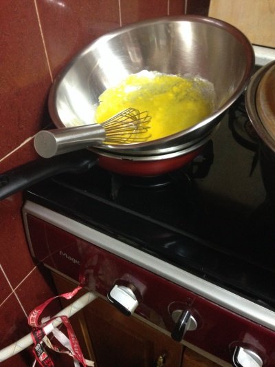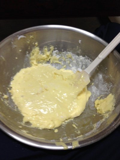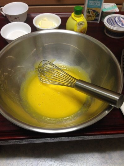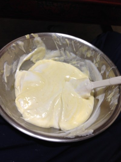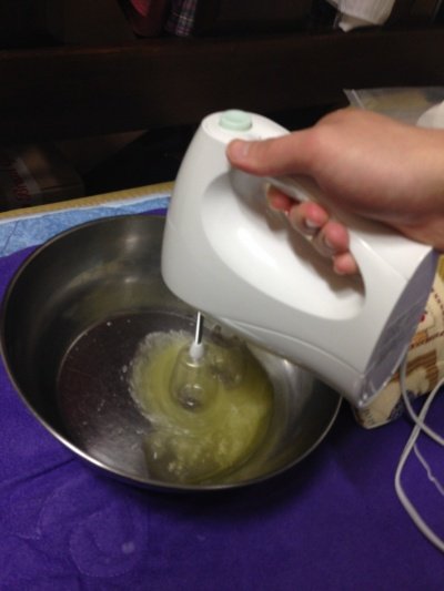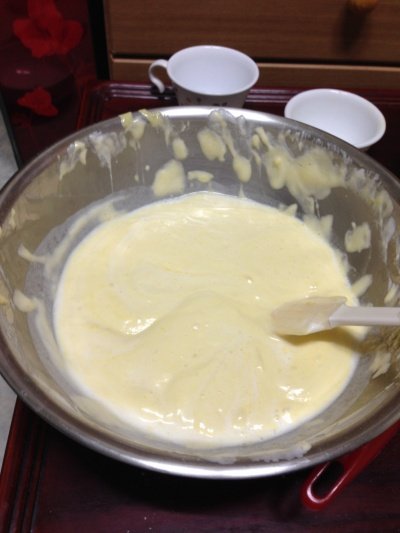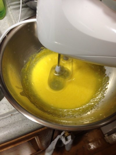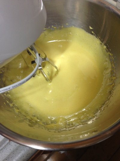 위의 사진처럼 어느정도 온도가 오른 볼을 빼서 열심히 섞어주세요 설탕과 소금 바닐라향이 잘 녹도록 그리고 크림화 된 반죽의 색이 위 정도나 비슷하면 거품기 자국이 남을 정도로 휘핑하고