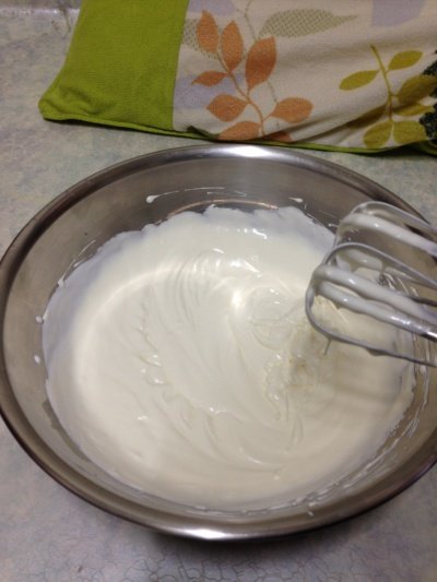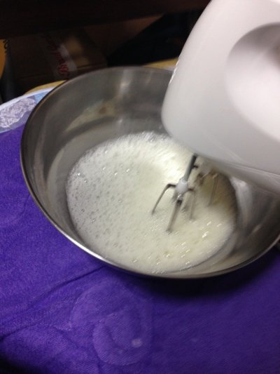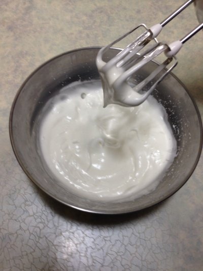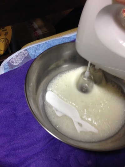2. 휘핑크림(혹은 생크림)에 설탕을 넣고 거품기를 고속으로 해서 섞어줍니다. 완전한 생크림이 아닌 80%정도 되도록 해줍니다.
