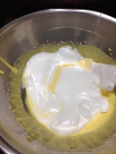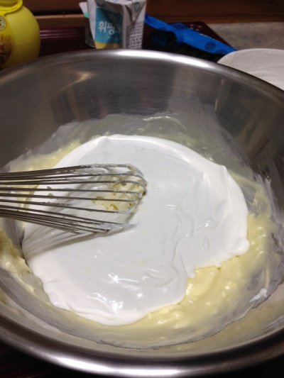 밀가루가 다 섞이면 남은 머랭을 다 넣고 섞어주세요.