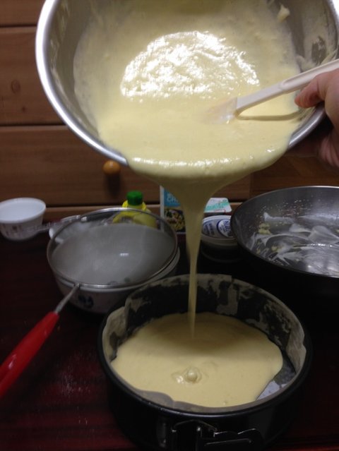 5. 4에서 만든 반죽을 25~30cm 높이에서 반죽을 떨어뜨란다는 느낌으로 틀에 부어줍니다.