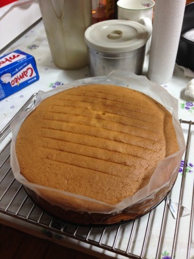 다 구워진 제누와즈 인데요 시간을 보면서 중간에 한 번 젓가락 같은걸로 반죽이 묻어나오나 안나오나 체크해보세요(일명 꼬지체크) 반죽이 묻어나오지 않으면 다 익은 겁니다. 구워진 제누와즈를 꺼내서 식힘망에 올립니다. 한김 식히고 바로 다시 뒤집어 주세요. 유산지는 40분에서 한시간 후 정도에 떼주시면 됩니다.