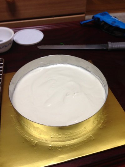 6. 커피액을 발라주고 위에 크림치즈무스를 올린 후 스페출라로 깨끗하게 정리합니다.