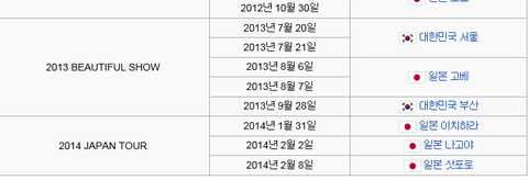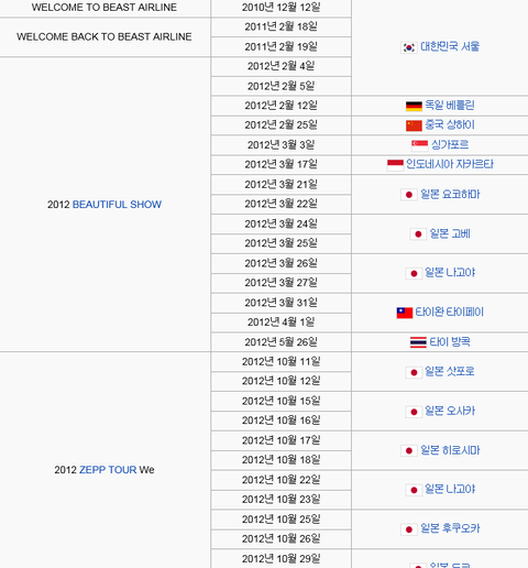 지금까지 비스트 콘서트 현황임( 월드투어는 위 표에 안나와있음)