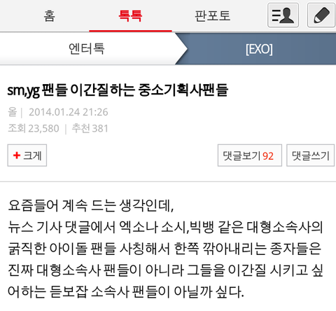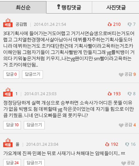진짜 중소 소속사들 이라고 사재기 한다는건 뭔 논리? 중거 있어? 우리가 언제 이간질 시켰죠? 화나네 정말 일위 하면 사재기 일위 못하면 듣보잡 싫다 정말 중소 소속사 인게 잘못이네요 중소 소속사들은 일위 하면 안되나봐요 삼대 소속사 팬분들 문자 투표 열심히 해서 일위 안겨 줬는데 사재기 정말 잘나셨네 우리도 비아냥 거리는거 싫어해요 당신들도 우리가 무시 하면 싫잖아요 삼대 소속사들 노래보다 중소 소속사 노래가 좋다 하면 듣보빠순이 참 어이 없네요 안 그랬음 좋겠습니다 우리도 충분히 기분 나빠요. 그럼 당신들이 쯕 일위 해먹으세요 중소 소속사 애들은 일위 해먹다 욕 쳐먹겠네요.