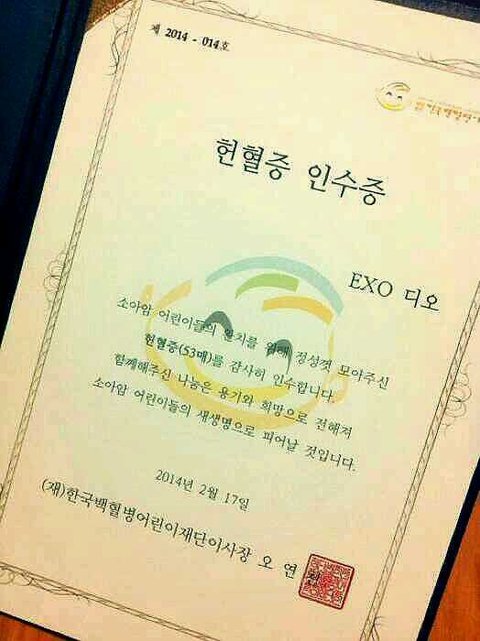 이거팬분들이경수생일때 경수이름으로 헌혈기부한건데 나중에피받은사람들이 누가도와줬냐고하면 도경수라고할거야 팬들이도경수위해서이래줫다 무개념이랑사생ㅇ만없으면 다좋을텐데 아쉽다 난경수가이글봤음좋겠어 어찌됫든간에 ㅎ ^^.. 베톡안올라가도뭐이렇게많이읽어주시고 추천눌러주셔서 좋아요 ~