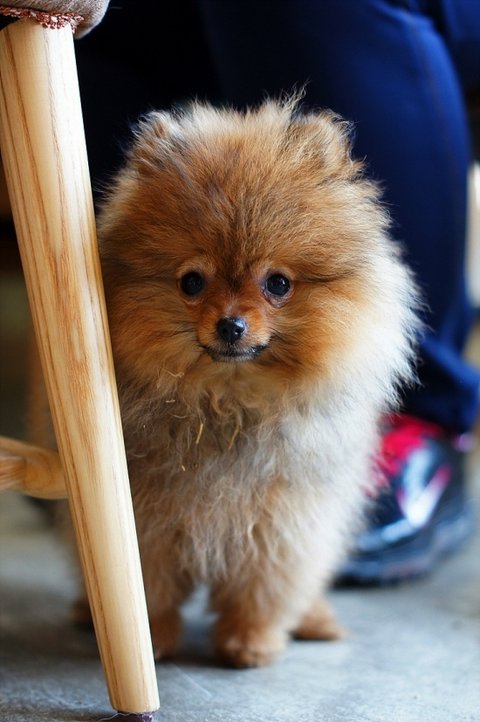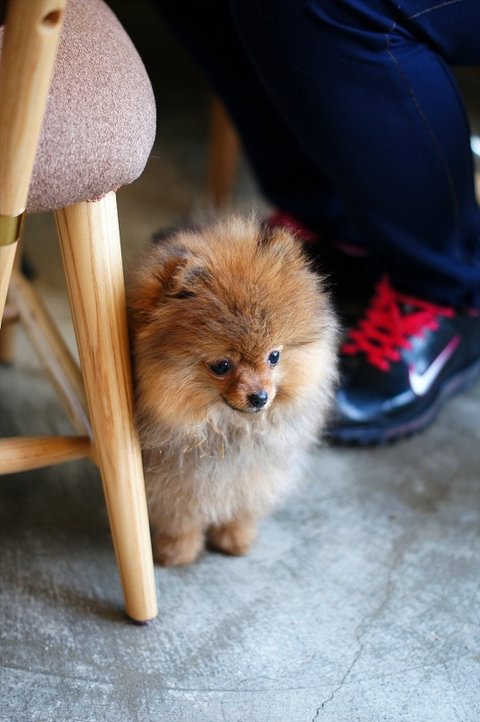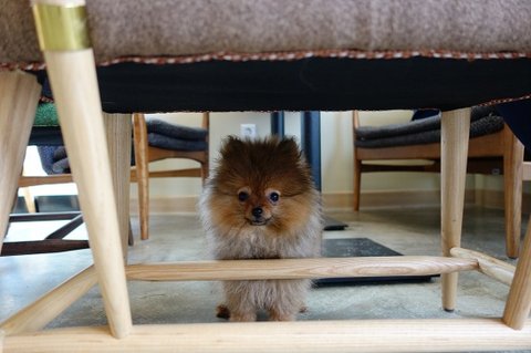 탁자 밑에 있는 귀여운 포메라이안 강아지