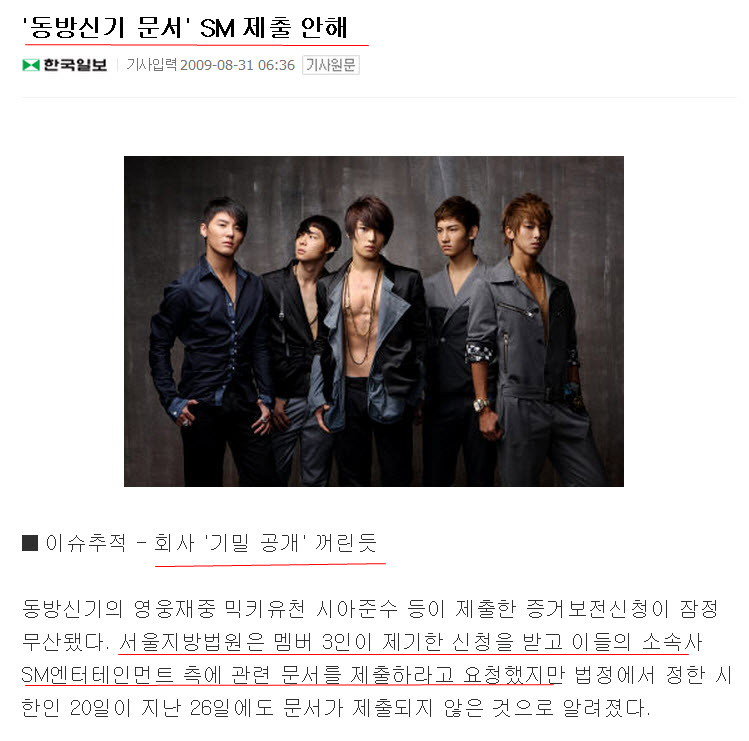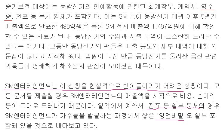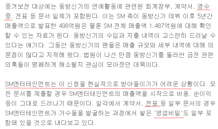 ■ 이슈추적 - 회사 '기밀 공개' 꺼린듯 동방신기의 영웅재/중 믹키유/천 시/아준/수 등이 제출한 증거보전신청이... 일각에서 계약서, 전표 등 일부 문서의 경우 SM엔터테인먼트가 가수들을 발굴하는 과정에서 쌓은 '영업비...