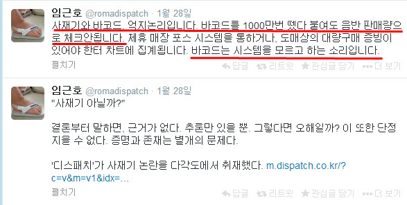- 바코드로 아무 돈도 안들이고 공짜로 음판조작을 해서 판매량 늘렸다고 주장하며 가온챠트 주간순위 나오면 빼박켄트 걸릴거라고 하더니 가온이 한터 판매량보다 많이 나오자 월간 판매량이 떠봐야 알수있다며 이젠 소속사가 반품을 못하니 재정적 손실이 어마어마 할거라고 말을바꿈. 돈도 안들이고 바코드로 조작질 했다면서? 처음 주장한건 다 까먹나? 바코드 음판 수치조작이라면 출하량이 있을수 없는데 어떻게 반품을 하나?