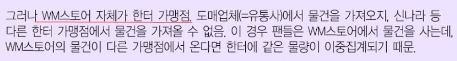 WM 스토어는 한터 가맹점이 아니다. 2방팬들이 스토어에 전화를 걸어서 '거기서 공구 참여해도 한터에 반영되요?' 라고 물어서 직원이 '그렇다'고 대답한것 가지고 한터가맹점이다! 라며 선동질 중인데 공구해본사람은 알것이다. 총대가 공구싸이트 열어서 한터집계되는 판매처에서 구입해와서 팬들에게 배송하면 당신이 한터 가맹점이 되는가?왜 저렇게 말도 안되는것가지고 우기는지