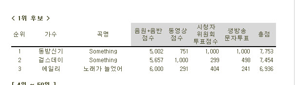 시청자위원회점수와 생방송문자투표(총합 만점 2000점) . 이 두개는 거의 빠순이들만의 투표라고 보면 된다. 걸스데이한테 천점정도 뒤지고 있다가 빠순이 투표점수로 겨우 총점 3백점 차이로 이겼다