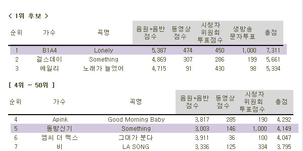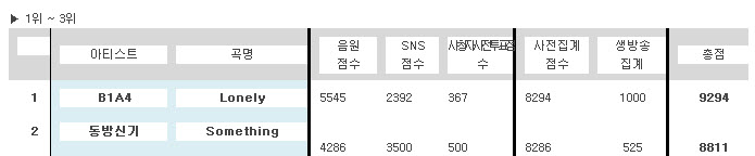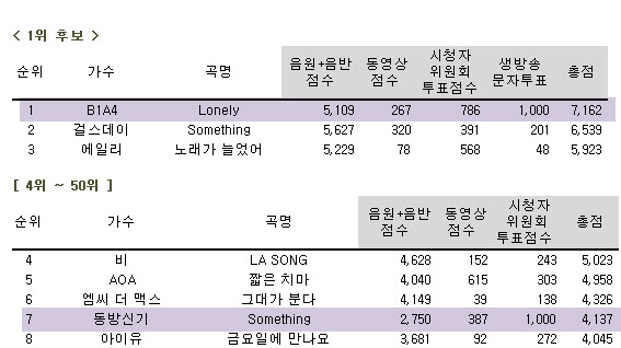 각 방송사 순위를 보니 b1a4가 없었다 치더라도 어차피 1등을 못했을 점수다.