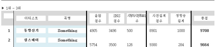 1월 3째주 걸스데이와 동방신기가 만났을때 점수표도 살펴봤다.