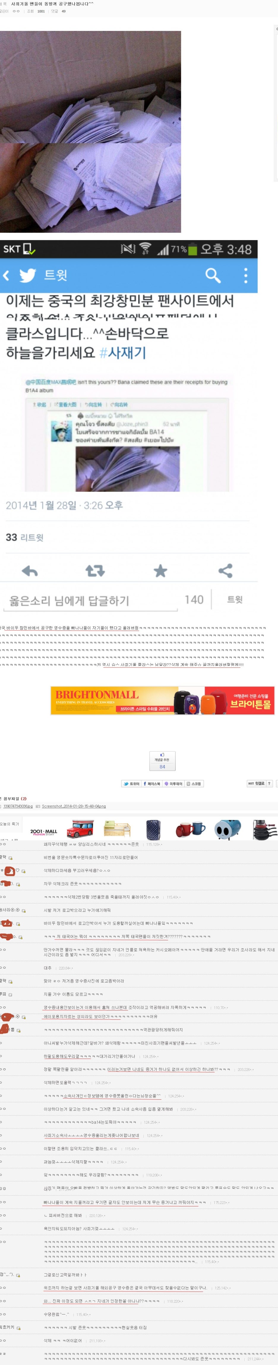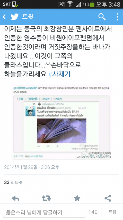 달랑 2천장 보여준건지 안보여준건지 내용도 부실해 보이는 영수증 보여주고 저걸 바나측이 도용해서 b1a4영수증으로 바꿔치기 해서 보여줬다는 거짓말 까지 하는걸 보니제정상팬덤은 아닌듯 하다 달랑 2천장짜리 영수증을 b1a4측이 자기네영수증이라고 사기치고 올렸다며 여론몰이 하는 현장