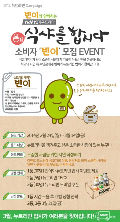 추첨을 통해 뉴트리빈이 빈이와 함께하는 밥차 이벤트를 선물할 기회가 주어진다는데요 ! 또한 뉴트리빈 1박스 및 모바일 이용권을증정한다고 하네요 ㅎㅎ