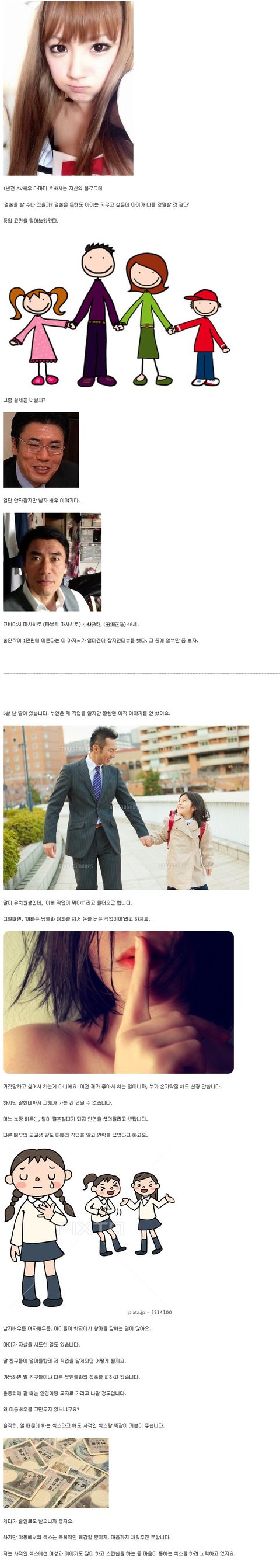 글쎄,,, 자기 합리화 정도로 밖에 안보이는 건.. 뭘까.. 그렇게 두렵고 마음이 허하고 남보기 창피하면 그만 두고 다른 일을 찾아야지 . 그런게 아니라면 스스로 자랑스러워 하면서 살라구. 어짜피 그 직업이라는게 일반적인건 아니잖아? 그럴꺼면 당당하기라도 해야지 . 또라이 소리를 듣더라도. 일하면서 섹스하니 기분 좋고 돈도 받으니 얼마나 좋아~ 이러면서 불쌍한 피해자인척 핑계는... 대다수의 사람들이 얼마나 힘들게 돈 벌고 화장실에서 물틀어 놓고 우는 한이 있어도 직장 생활 하며 살고 있는데... 참.. 좋아 보이진 않네...