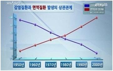 전에 SBS 스페셜에서 [살균의 함정]편을 보면 현대사회에서 갈수록 전염병이 걸릴 확률,