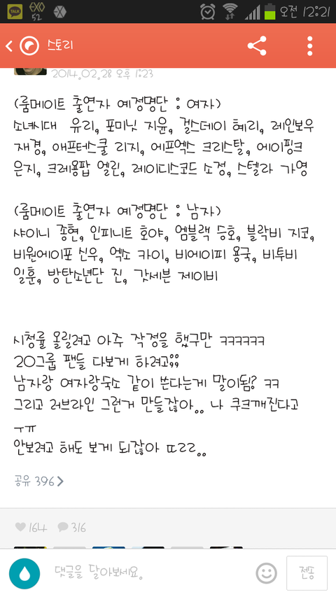 아. .진짜 이럼안되는데;; 진짜 동거? 미쳤어방송국아?시발어쩌라고;; 하? 시발 어카라는건데;; 같이살아? 그러다가 사귀면 어쩔수 없어 근데 시발 방송이먼저 연애하라고 터주냐? 시ㅋ발 아직 안정한거라지만;;진짜 이건아닌듯