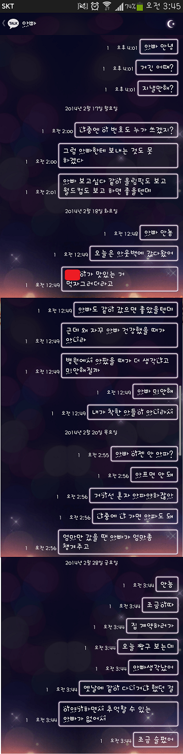 솔직하게 있잖아. 군대에서 더 힘든 것도 해보고, 더 더러운 것도 해봤는데아빠 소변 보고, 대변 보고 하는 거 해주는 거 하나도 힘든 거 없었음내가 자원봉사 나와있는 것도 아니고 우리 아빠니까근데 아빠가 나한테 매번 그랬음."우리 OO이한테 못 볼 꼴을 보인다.", "니가 아빠 때문에 괜히 힘들다."