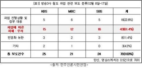 방송3사 가운데 가장 편파적인 보도를 한 곳이 바로 KBS였다. 파업을 불법으로 규정하고 엄정 대응하겠다고 으름장 놓는 국토부, 검찰, 경찰 관련 보도가 3사 중 가장 많았다.