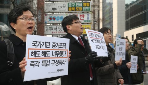 Members of the Lawyers for a Democratic Society hold up signs calling for the launch of a special probe into the prosecution’s alleged evidence fabrication in a case against a former official of the Seoul Metropolitan Government outside the ruling Saenuri Party’s office in Seoul on Wednesday. (Yonhap)