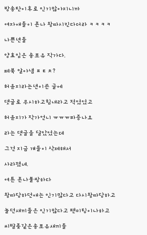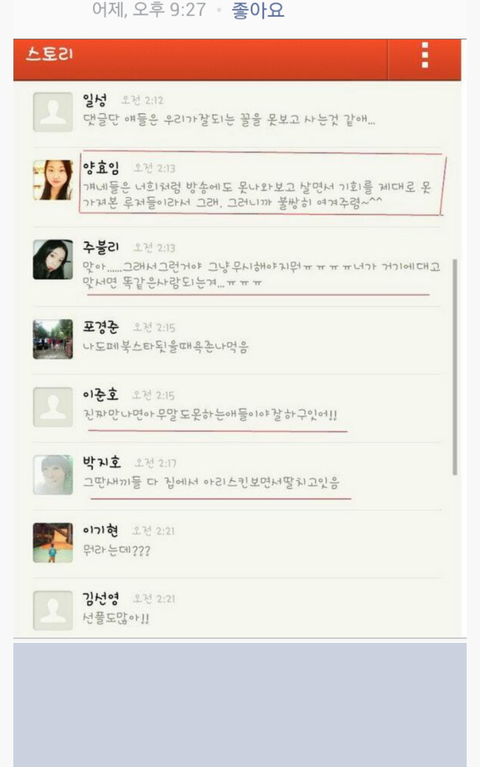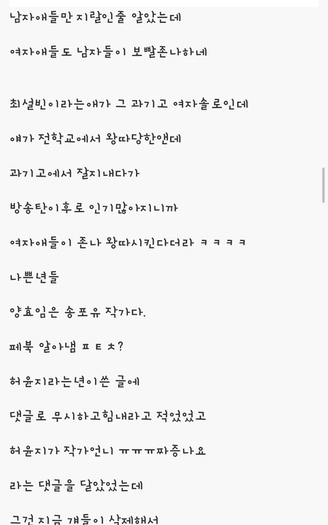 김연아 욕한건 진심ㅋㅋㅋㅋㅋ 하긴 자긴 한번도 그렇게 살아본적이 없으니까 그런 스핀, 점프가 그냥 나오는줄 알겠지. 평생 약 18년을 걍 놀고먹고 삥뜯고 살아왔는데 노력이란걸 알겠나ㅡㅡ 연예인병은 진짜 웃기지도 않는다ㅋㅋㅋ 너희중에 진짜 집에 빽있거나 한 애들빼곤 미래가 훤하다 진짜.