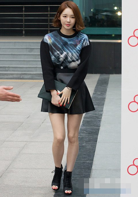 독특한 우주 프린트 맨투맨 티셔츠에 플레어 미니스커트를 입은 깜찍한 강민경