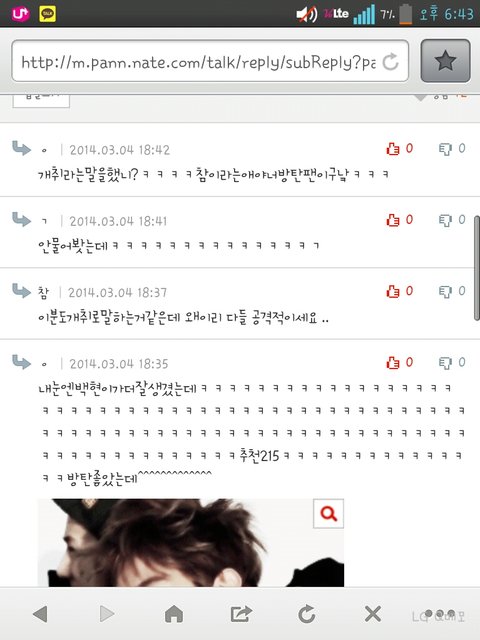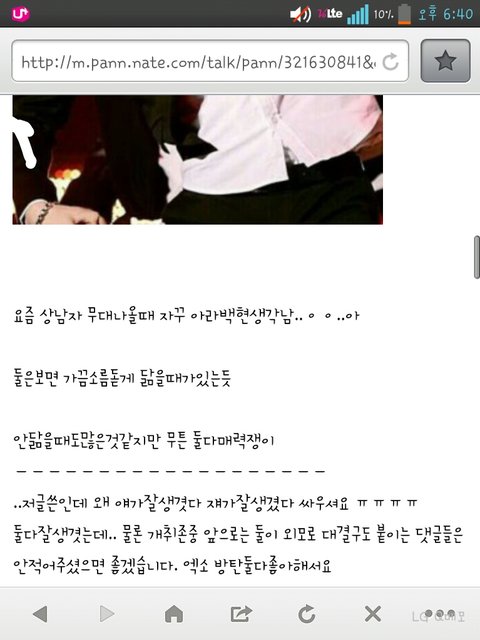 문제는 이베플 이베플이 쓰여지고 톡선이되기전까진 댓글들이 그냥 오좀닮은듯 이런거엿는데 조회수도 많아지고 추천수도 좀있어서 베플이 되니 엑소팬분들 슬슬빠치기시작함 이 댓글이 베플이 되고얼마안되서 글쓴이는 제발대결구도 만들지말고 선플만달아달라함 그리고 어디서똥을싸는지 야자를하는지 글을지워달라해도 안지워줌 야자를하는거면 오늘안에지워주겠지만