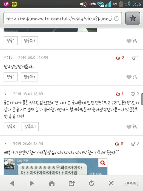 진짜 네이트판은 엑소팬이대다수니까 그런데 팬코하면서 엑소까내리거나 그러면 엑소팬분들은 하나하나 다반응해줌 그리고글쓴이가 대결구도만글지말라했는데 밑에댓글20개만 선플이고 나머지는 다 엑소팬들이 베플땜에빡친다고 내눈엔 백현이짱 이런댓글 대다수 진짜 무시개쩜