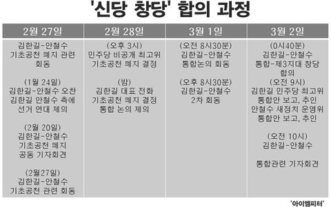 실제로 김한길 대표가 통합을 제의한 시간이 2월 28일 밤이기 때문에 대략 36시간 만에 '신당 창당' 합의가 결정됐습니다.