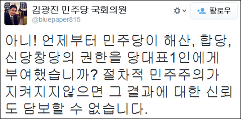 김광진 의원의 주장처럼 '신당 창당'은 찬성하나, 그 절차와 과정에 민주주의가 빠져 있다면 분명 신뢰성이 떨어질 수밖에 없습니다.