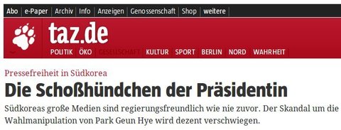 독일의 언론이 한국의 언론에게 직격탄을 안겼다. 독일의 진보언론인 타쯔(Taz)는 21자 기사에서 제목부터 ‘Pressefreiheit in Sudkorea Die Schoßhundchen der Prasidentin-대한민국에서의 언론의 자유, 대통령의 무릎에서 노는 애완견‘이라고 언론으로서는 보기 힘든 단어로 제목을 뽑아 권력에 개가 된 한국의 언론 상황에 빅엿을 먹였다. 이 신문은 대한민국의 주요언론이 현 정권에 어느 때보다 우호적이라며 박근혜의 부정선거 스캔들이 슬며시 감춰지고 있다고 보도했다. 특히 이 기사는 박근혜 연두 기자회견 모습을 전하며 한국 저널리즘의 위기가 고스란히 드러난 모습이었다고 짚었다.
