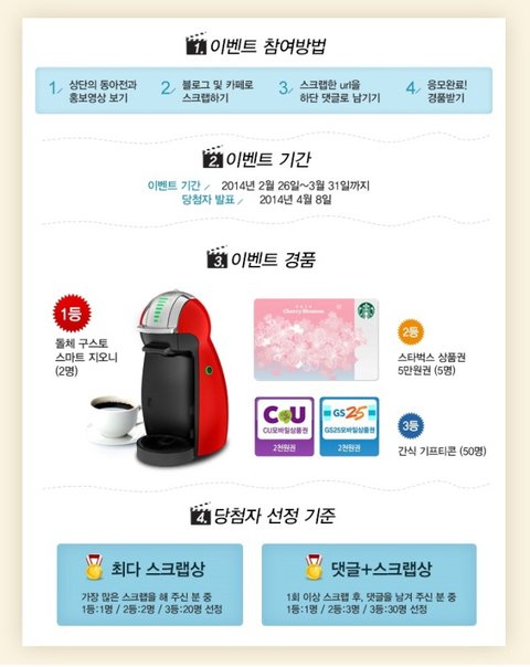 아무튼 1등이 돌체 구스토 스마트 지오니 2명, 2등이 스타벅스 상품권 5만원 권 5명, 3등이 간식 기프티콘 2천원 권 50명