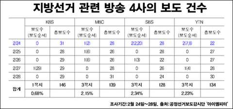 '공정선거보도감시단'이 발표한 1차 모니터 보고서에 따르면 KBS는 지방선거가 100일 앞으로 다가온 2월 24일에 관련 뉴스를 단 한 건도 보도하지 않았습니다.
