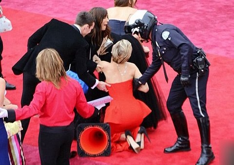 최근 오스카 시상식 레드카펫에서 걷다가 또 넘어지는 굴욕 당한 제니퍼에게