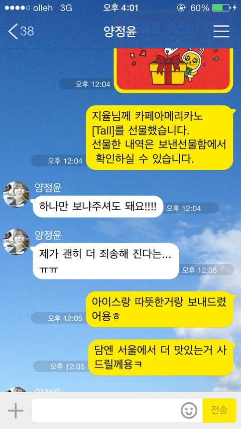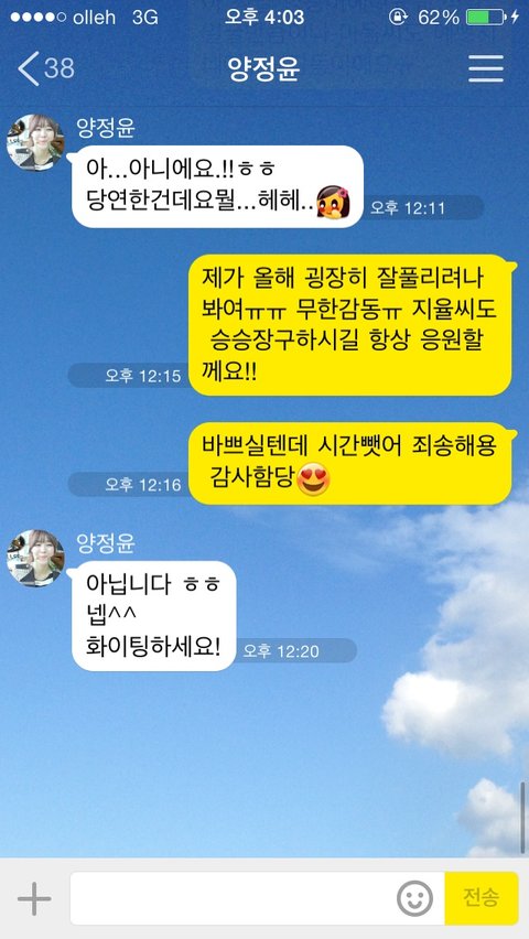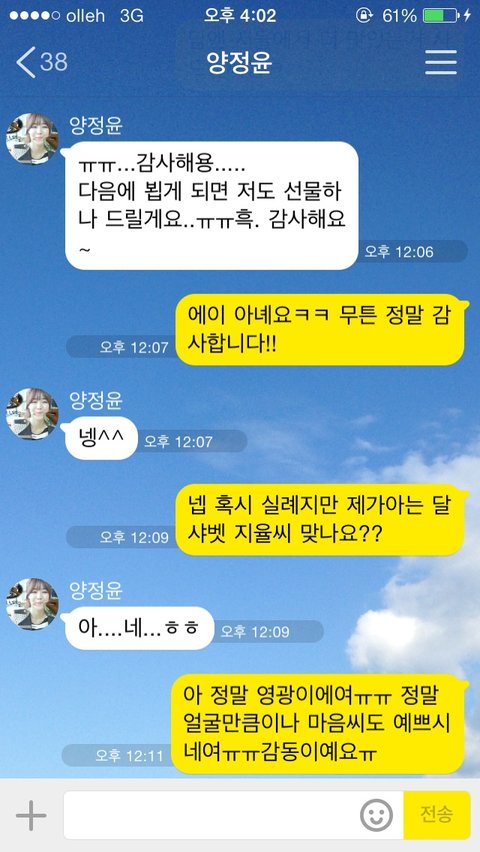 카톡을하면서 처음엔 이분 달샤벳 지율씨 팬이신가봉가 생각하다 왠지 본인일수도 있겠다는 생각에 곧바로 검색을 해보았고 본명과 카스에 생일이 일치하자 조심스레 물어보게 되었습니다