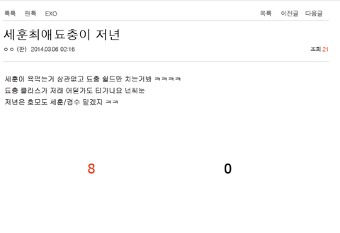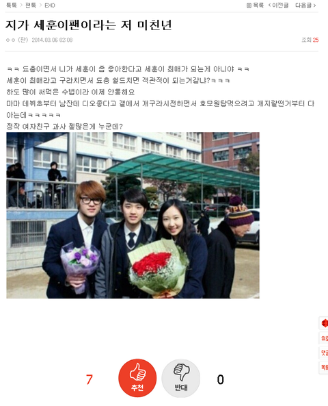 "나는 악개인데 너는 됴충이?" 라고 당당히 악밍아웃 했다 ㅋㅋㅋ 그럼 이시간에 그런 악개가 있다는걸 너넨 부정할수없는거고 세훈아 누나야 걔가 니네를 그런 상황으로 만들었다고 생각해서인지 곧 바로 디오 까는 글들과 경수야 누나야 라는 애가 나와서 디오팬과 디오를 까댔어ㅋㅋㅋㅋ 근데 어떻게 너네를 의심을 안하고 몰라?ㅋㅋㅋ 말투만 봐도 다 티가 나는데 ㅋㅋㅋ