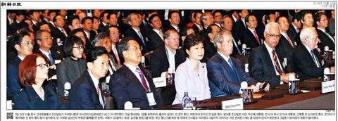 박 대통령은 축사에서 “존경하는 방상훈 사장님”이라고 인사한 뒤 미국 항공우주국이 촬영한 ‘한반도 야경’ 사진을 언급하며 ‘불빛 없는 북한’ 얘기를 꺼냈다. 그러자 사전에 조율된 듯 방 사장 역시 박 대통령이 언급한 그 사진에 대해 말을 이어갔다. 잘 짜맞춘 시나리오를 보는 듯했다.