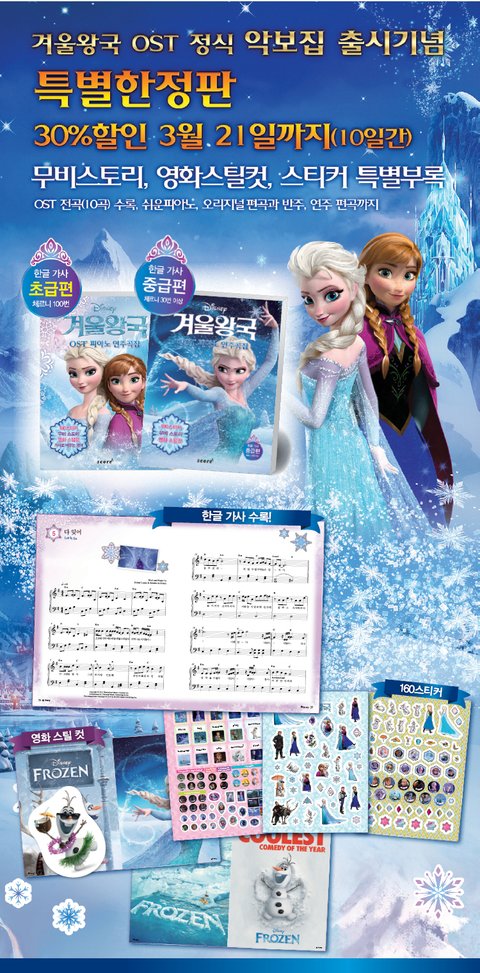 게다가 월트디즈니컴패니코리아(주)와의 정식 계약으로 영화에서나 볼 수 있었던 아름다운 장면들을 악보집 중간 중간에 스토리 페이지와 스틸 컷 등으로 삽입하여 시각적인 즐거움을 더했고, 특별한정판으로 아이들이 좋아하는 ‘겨울왕국’ 스티커도 들어있어요 ㅋㅋ 전 스티커가 가장 탐나더라고요 ~