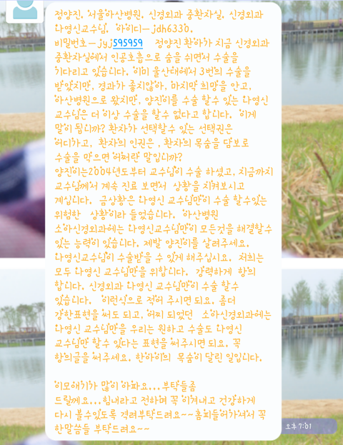 지금상황은 나영신 교수님만이 수술 할수있는 위험한 상황이라고 들었습니다. 양진이의 부모님인 이모와 삼촌께서는 10년동안 양진이를 맡아오셨던 나영신 교수님께 꼭 수술을 받기를 희망합니다.