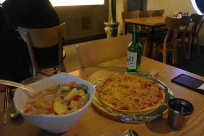 화채를 시켰더니 피자가 서비스~~!! 한쪽에는 쇼케이스에 모자를 같이 판매하고