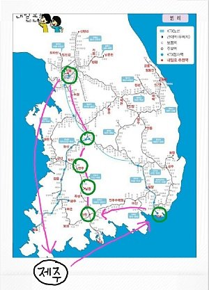 저의 여행 코스는 제주-부산-순천-남원-전주-대전-서울-제주 !!!!!