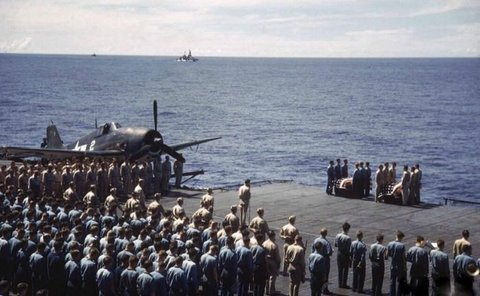 USS Lexington 갑판 위에서 거행된 장례식. 1944