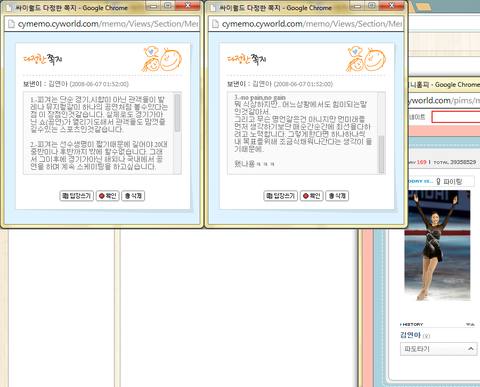 그런 사람이 아니었으면내가 "인터뷰 하던 중 미처 못 받아 적은 것이 있는데, 제가 드렸던 질문에 다시 답변을 주실 수 있을까요? ㅜㅜ" 라는 싸이 쪽지 질문에 피곤한데 굳이 시간을 써 가며 밤 약 2시에 이렇게 일일이 답변을 달아 주었을까?그 덕분에 문제 없이 제 시간에 인터뷰 자료를 동아리에 제출할 수 있었고,그래서 지금도 내가 고이 간직하고 있는 싸이월드 쪽지들이다.
