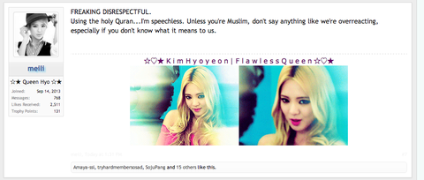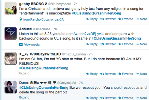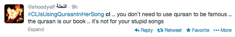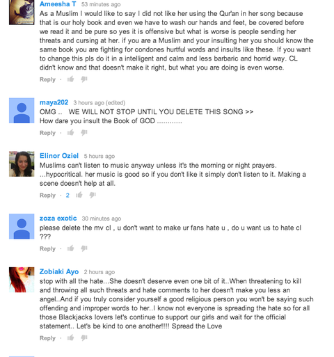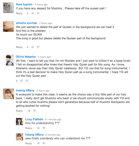 무스림분은 코란은 아주 신성하게 생각해서 씨엘 멘붕 노래를 들으니까 화가났어. 우리는 그 노래 그냥 무시하지 못해.