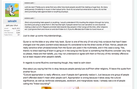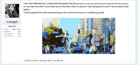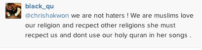 외국팬들이 화가난 이유: 무슬림 분따르면 이슬람의 성서는 그렇게 쓰는거 그 무슬림분들에게 감장을 상한편이에요. 특히 그 성서의 문장은 노래중에 쓰니까요.