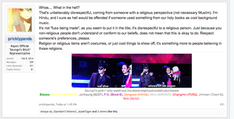 : 이거 뭐? 아주 실례하는거에요. 저는 무슬림 아니지만 신념은 아주 진지하게 생각해요. 다른 사람의 중교는 엔터테인먼트위헤 이용하지마. 실례하고든.