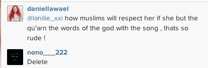 무스림인에게 코란은 (코란: 무스림의 성서) 아주 특별한 것이에요. 그 안에 우리 하나님의 말 있어서 노래위해 이용하는 것은 우리 나쁘게 생각해요. 우리 신념이에요. 그래서 우리 성서를 잘 이해 못하게 이용하지마세요. 다른 사람들 감정을 생각하세요.