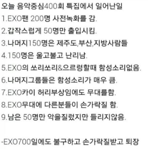 엑소700일이라서진짜네이버에계속연관검색어만들고준비많이했는데음중가서팬들몇명만들어가고진심속상함