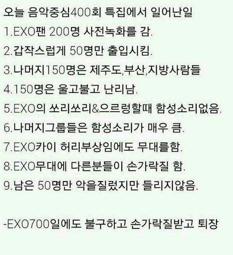 다른날 같았음 넘어갔는데 .. 종인이 허리아픈데도 두곡을 참아가며 열심히 했는데 .. 손가락질 하는 당신들 봤을 때 기분 어땠을 지 생각 못함? 왜 우리들은 뭘해도 욕을 먹는거임? 우리가 오늘 뭐 잘못한거 있음? 엑소 보러 200명이 왔고 거기서 인원수 잘라버리고 엑소 오랜만에 무대나왔는데 거기서 그런 짓하고